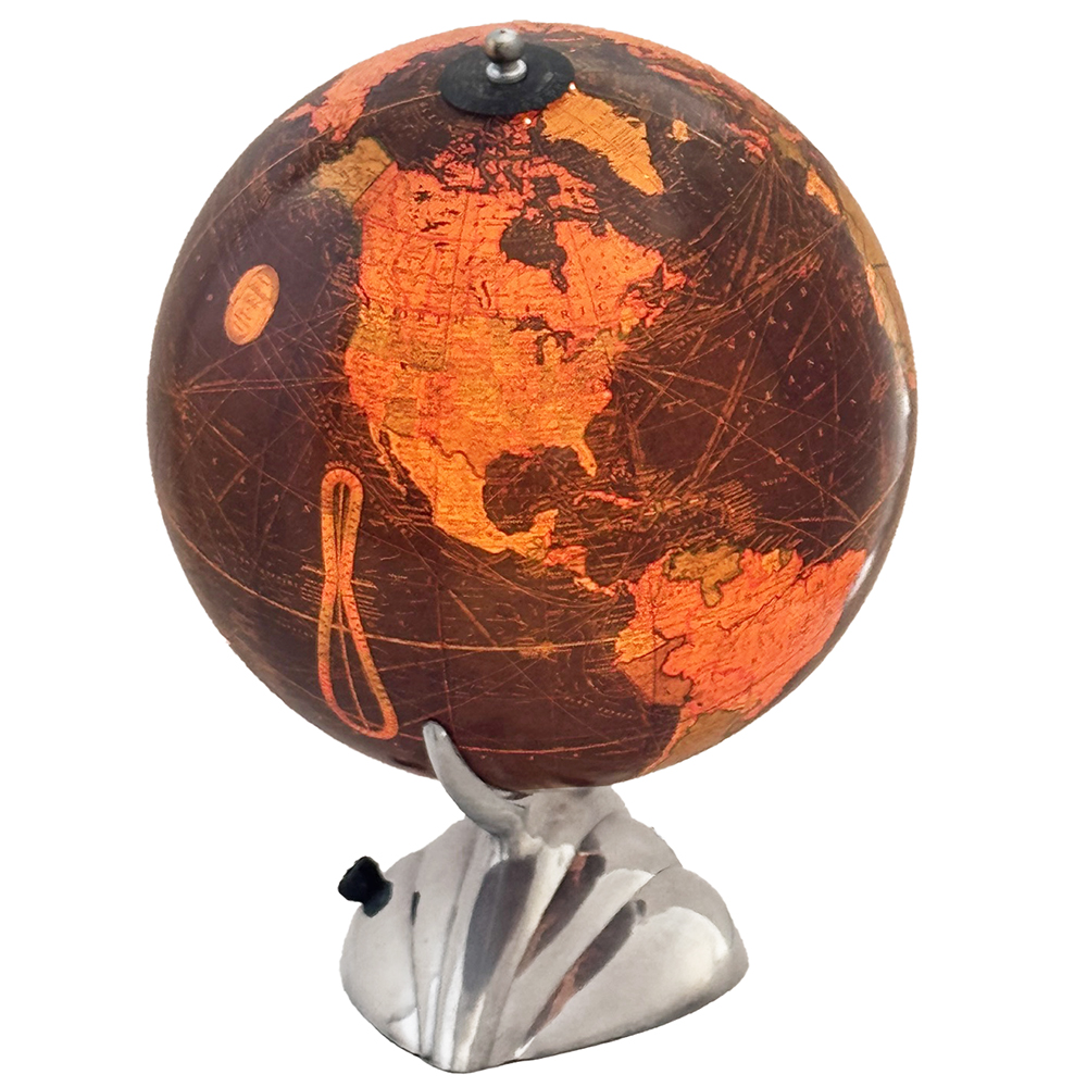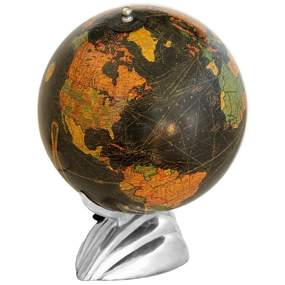 This 1930’s light-up world globe is glass with a paper world map laminated to it. The cast metal base is in the form of a stylized streamline airplane.