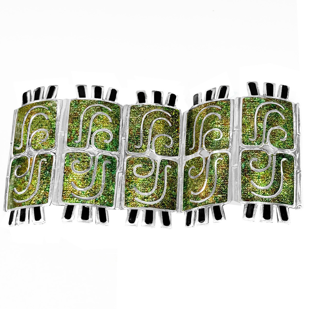This is an extraordinarily rare bracelet. It is very wide with both solid and speckled green enamel. It has the full Margot de Taxco sterling mark as well as the number of the design. The catch works perfectly and there is a safety chain attached. It is in fine condition. Margot Van Voovhies Carr, an American from San Francisco moved to Taxco in 1937, married the silver designer, Antonio Castillo and began creating her own jewelry designs. After their divorce, she opened her own atelier in 1948, Margot de Taxco and remained in Taxco designing and producing until her death.