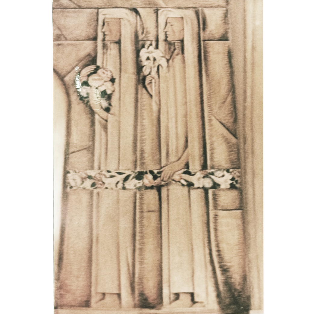 This Original Alfredo Ramos Martinez fresco panel “The Nun” is a fresco study for his mural in the Santa Barbara Cemetery Chapel. The technique is fresco on cement with a half inch wood frame. On the verso, there is a painting directly on the cement of a Mexican peasant. The piece is in excellent condition and has been in the owner’s collection for 43 years. The purchase includes a custom made solid maple wall mount that attaches to the wall and is fitted for the fresco panel to slide in to. This intimate work really shows the details of Ramos Martinez’s mastery of the fresco technique. The last 2 photos are of a few of the nuns that are pictured in the Chapel mural.