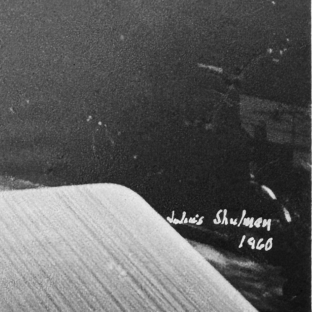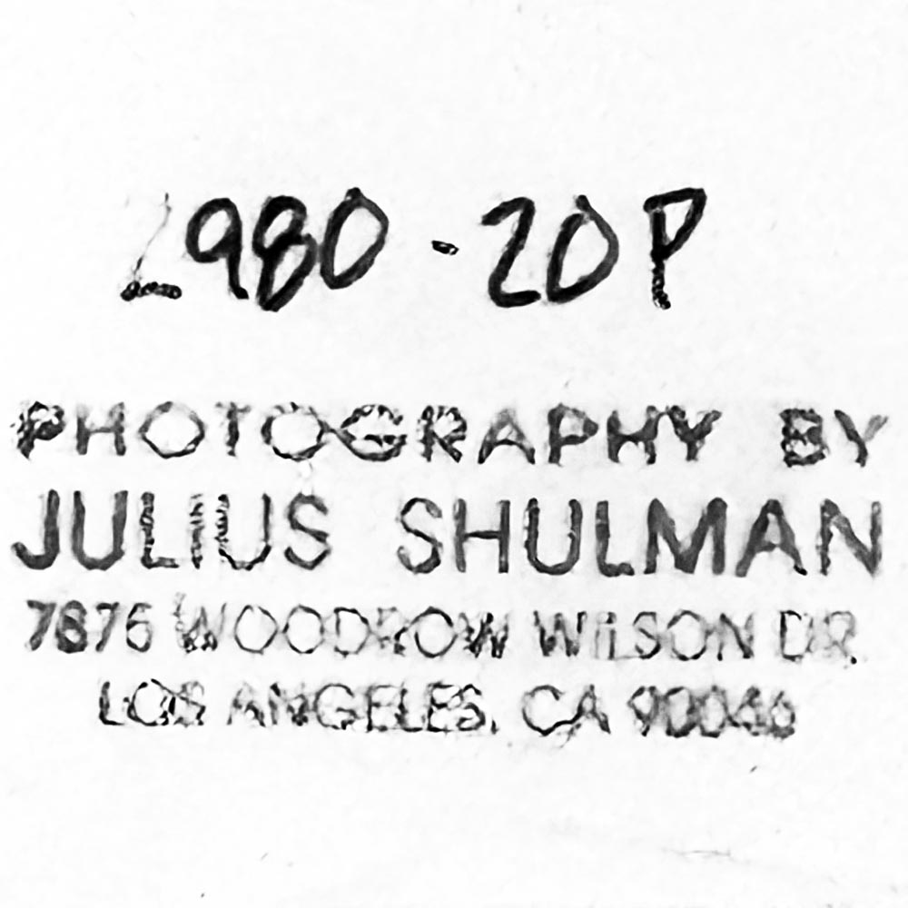 This is an original Julius Shulman gelatin silver print photo acquired directly from the photographer at his studio on Woodrow Wilson Dr. in 2000. It is in mint condition. This photo is framed with 8 ply archival matt and museum glass. It is signed and dated 1960 in white ink in the lower right hand corner of the image as well as numbered and stamped with “Julius Shulman 7876 Woodrow Wilson Dr. Los Angeles, CA 90046”. The framed measurements are 20.5 in. x 17.5 in. The photo measurements are below.