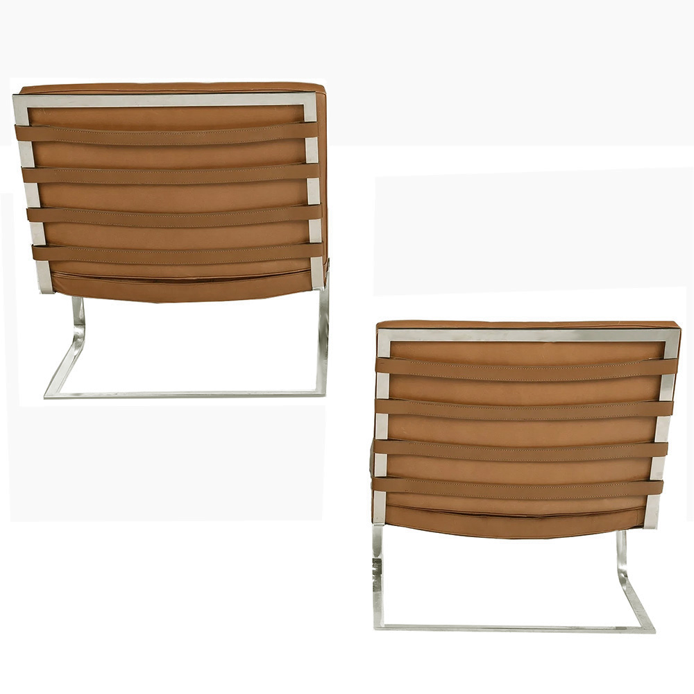This pair of Tungenhat chairs have stainless steel frames. The leather is the classic vintage Knoll tan and in excellent condition. They are very comfortable. The 1930 iconic chair was originally designed for Villa Tungendhat, located in Brno, Czech Republic, which was designated a UNESCO World Heritage Site in 2001. This 1930 house was the very first concrete and steel residence in Europe. The Tugenhat chairs were out of production for many years until just recently. The new frames are in only available in chrome or black coated stainless steel.