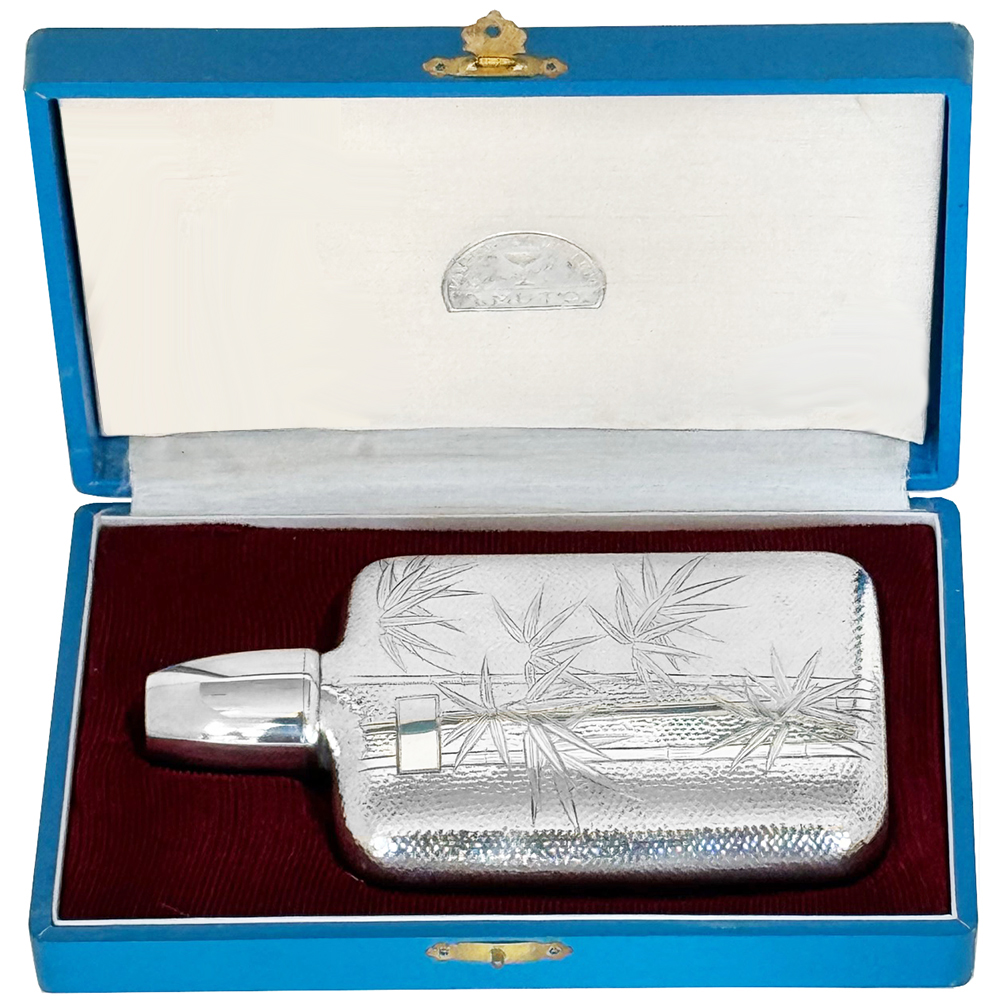 This beautiful sterling silver flask was handmade in Japan in the 1930’s by T. Moto. It has never been used and comes with it’s original gift box. The top unscrews to create a shot glass. There is another cap that also unscrews to pour the liquor.