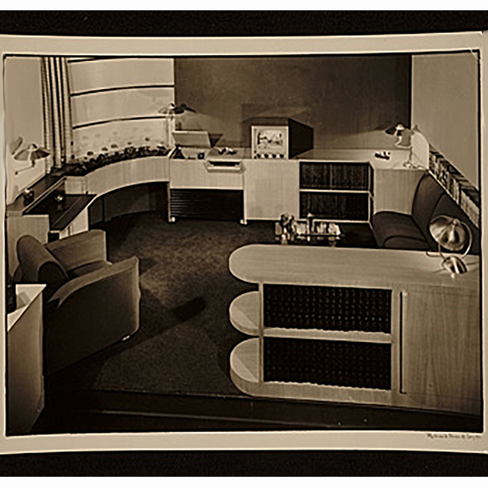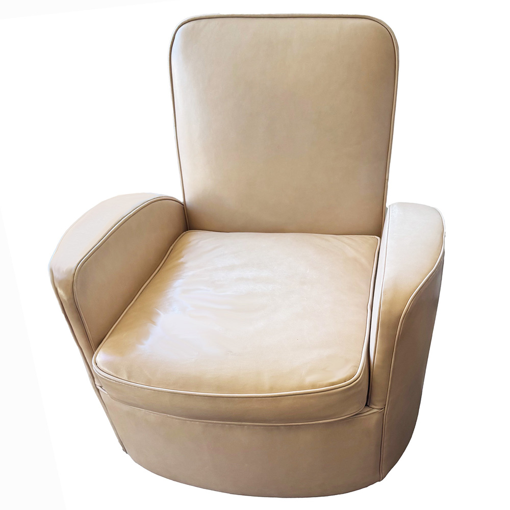 This is a classic American Streamline Art Deco lounge chair. It is part of the Musicorner room designed by John Vassos and displayed at the American at Home Pavilion, 1940 New York World’s Fair. It is upholstered in a soft creamy beige leather.