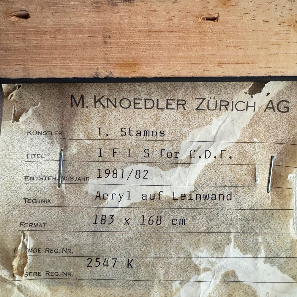 This large Theodore Stamos abstract expressionest painting is from 1981. It is from the Infinity Field, Lefkada Series for C.D. Friedrich . It is in great condition. Theodoros Stamos was a Greek-American painter, 1922-1997). During the late 1940s he became a member of The Irascible Eighteen, a group of abstract painters who protested the Metropolitan Museum of Art’s policy towards American painting of the 1940s and who posed for a famous picture in 1950; members of the group considered as the ‘first generation’ of abstract expressionists included: Willem de Kooning, Adolph Gottlieb, Ad Reinhardt, Hedda Sterne, Richard Pousette-Dart, William Baziotes, Jimmy Ernst, Jackson Pollock, James Brooks, Clyfford Still, Robert Motherwell, Bradley Walker Tomlin, Theodoros Stamos, Barnett Newman, and Mark Rothko. His work has ben exhibited in several prominent museums including the Whitney Museum, the Carnegie Institute the Art Institute of Chicago and MOMA.